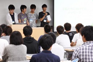 今回の訪問させていただいた授業は、1年生の前期に展開される必修科目「キャリア形成」の13コマ目、「大学での学び方(4)研究室訪問の成果発表」だった。