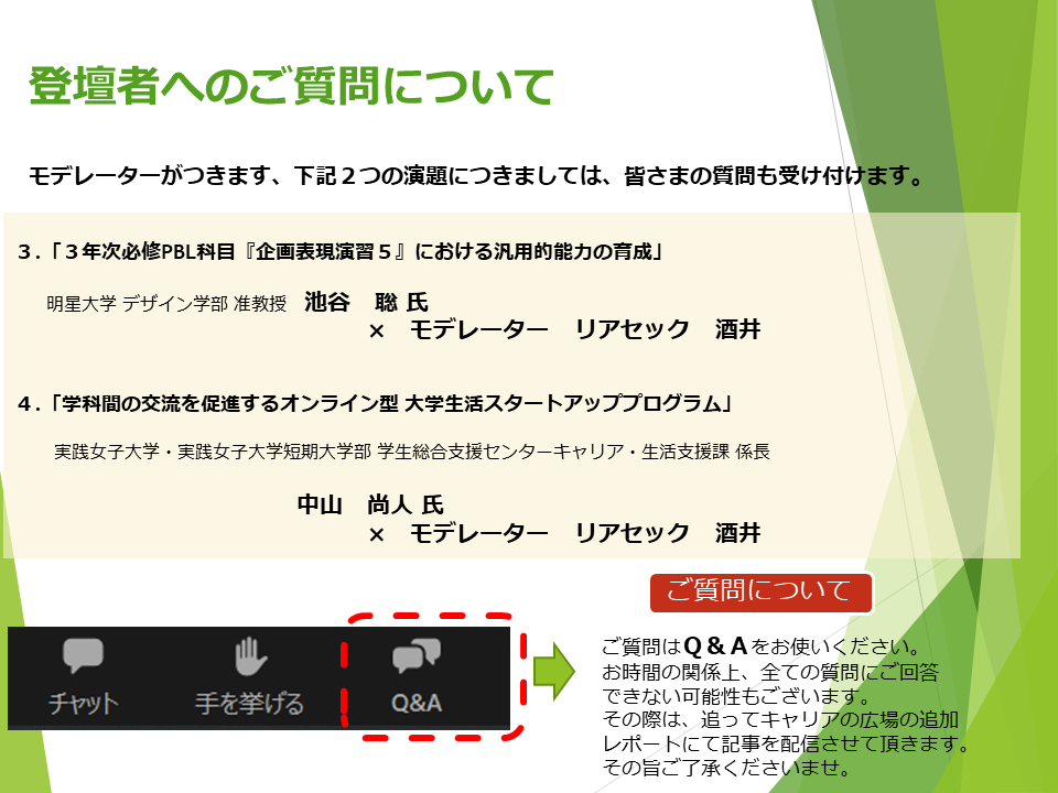 第1回に続き、このコロナ禍においても、ジェネリックスキル育成やキャリアサポートに腐心されている皆様のご参考になる2つの事例をお届けした。第3回以降の開催に向けて、皆様のご意見ご希望などをお寄せいただきたい。