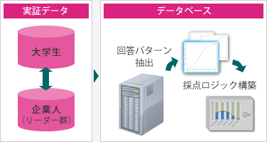 PROGでは、実社会で活躍する若手リーダー層の行動特性をデータベース化し、回答と比較判定する方式を取ることで、実社会で通用する可能性を示すよう設計されています。