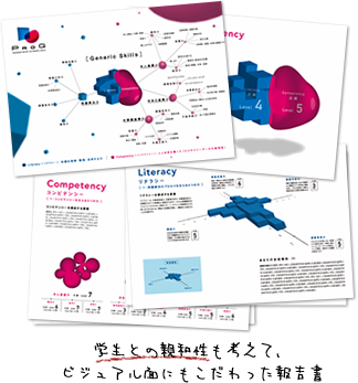 社会が求める汎用的能力=ジェネリックスキルを可視化し、教育成果の検証を行うことができます。リテラシーとコンピテンシーの2つの側面から客観的評価の指標を設け、育成を支援。教育改革の様々な場面においてご活用いただけます。